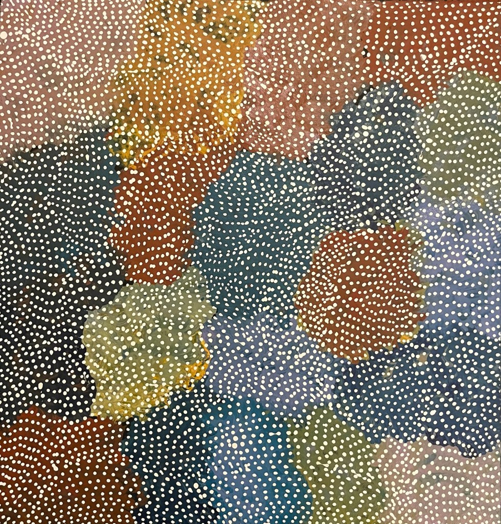 Bush Yam is an important food source in Aboriginal culture. It grows underground with only the shrub growing above ground. It can be found in the spinifex plains and flowers after summer rains. The Bush Yam tastes very like the sweet potato, but is also renowned for its medicinal properties. It is used to treat cuts, wounds, bites and rashes. Mary Rumble captures the Bush Yam in vibrant colours in a joyful celebration of their importance to Aboriginal culture.