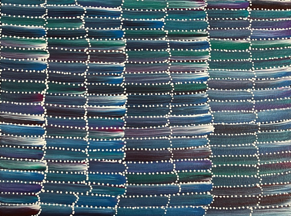 Jeannie’s paintings depict the Bush Yam. The seed of the yam is represented by the fine white dot work and the thick colourful brushwork represents the flower and the vegetable. Jeannie’s style is unique and she uses a bright and bold colour pallette.