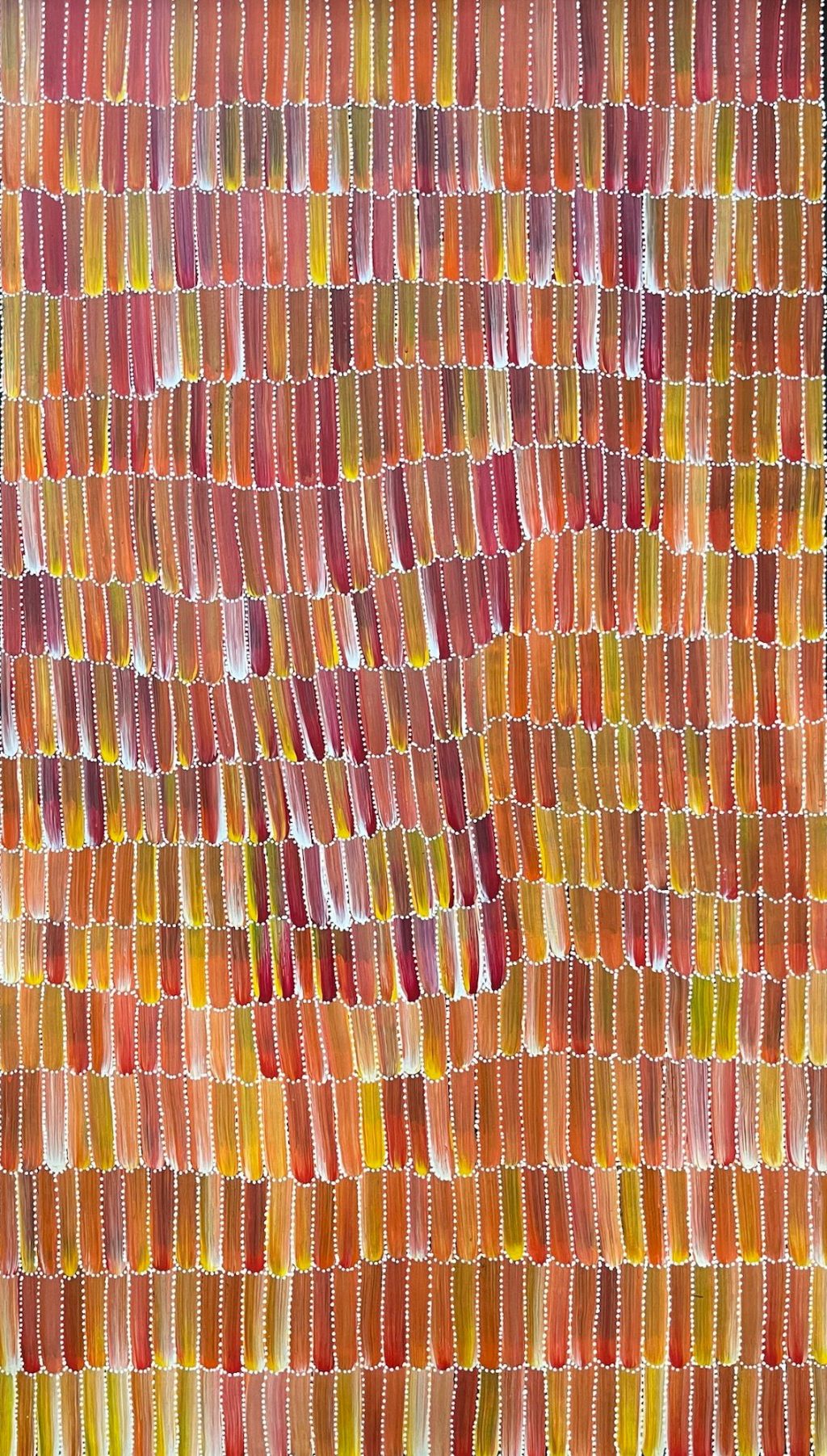 Jeannie’s paintings depict the Bush Yam. The seed of the yam is represented by the fine white dot work and the thick colourful brushwork represents the flower and the vegetable. Jeannie’s style is unique and she uses a bright and bold colour pallette.