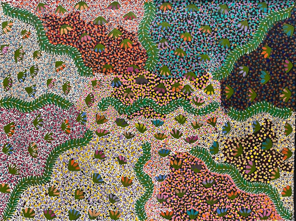 Bettrina Pula Bundey paints the Bush Medicine story, which she received from her mother. She also paints bush flowers and bush potato.