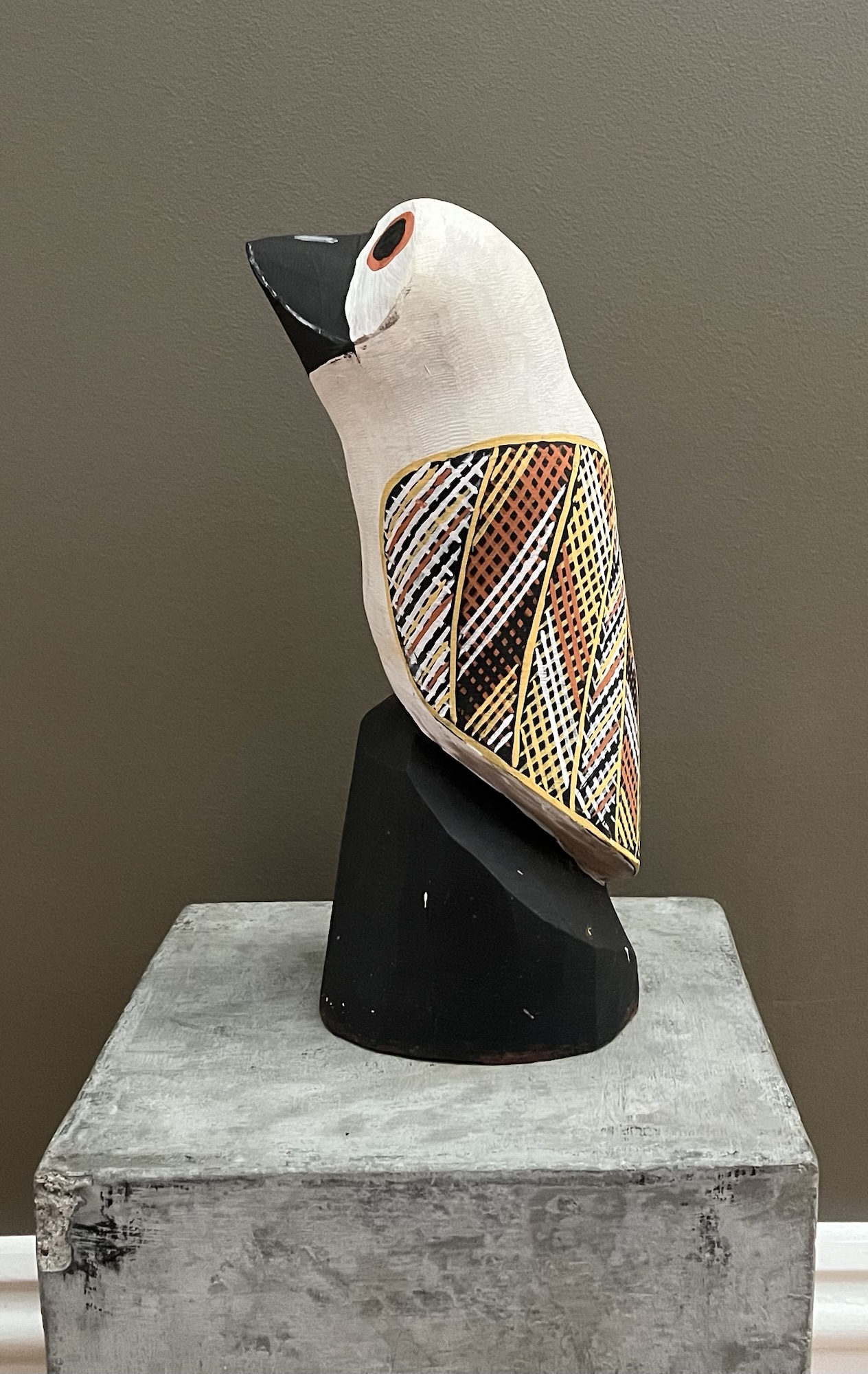Angelo Munkara is known for his skilful blend of tradition and individuality, creating works that are uniquely grounded in place yet appealing to collectors worldwide. Each beautiful bird is unique with their own character and reflect the rich cultural heritage of the Tiwi Islands.