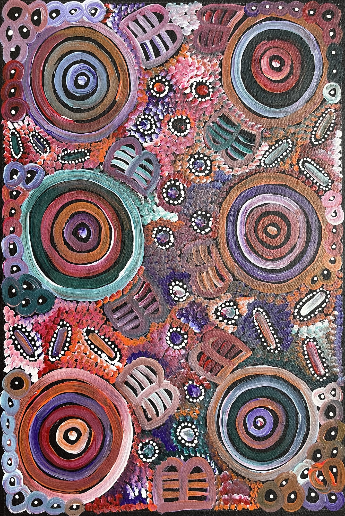 The patterns throughout Dulcie’s paintings illustrate women’s ceremonial body paint design. The design depicts waterholes where women perform ceremony, with the smaller circles representing bush tucker. Awelye – women’s ceremony, demonstrates respect & connection with the land. In performing these ceremonies they ensure well-being and happiness within their communities. Traditionally, the designs are made using red and white paints, but Dulcie uses a combination of bright colours to share this story.