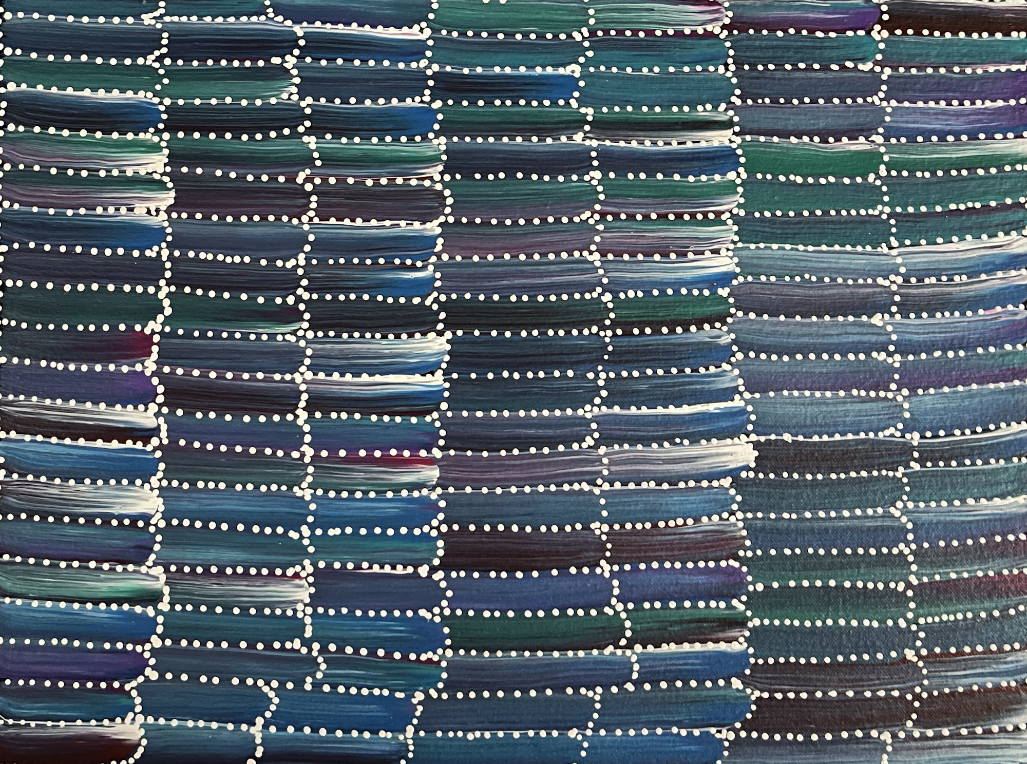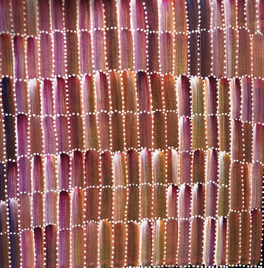 Jeannie’s paintings depict the Bush Yam. The seed of the yam is represented by the fine white dot work and the thick colourful brushwork represents the flower and the vegetable. Jeannie’s style is unique and she uses a bright and bold colour pallette.
