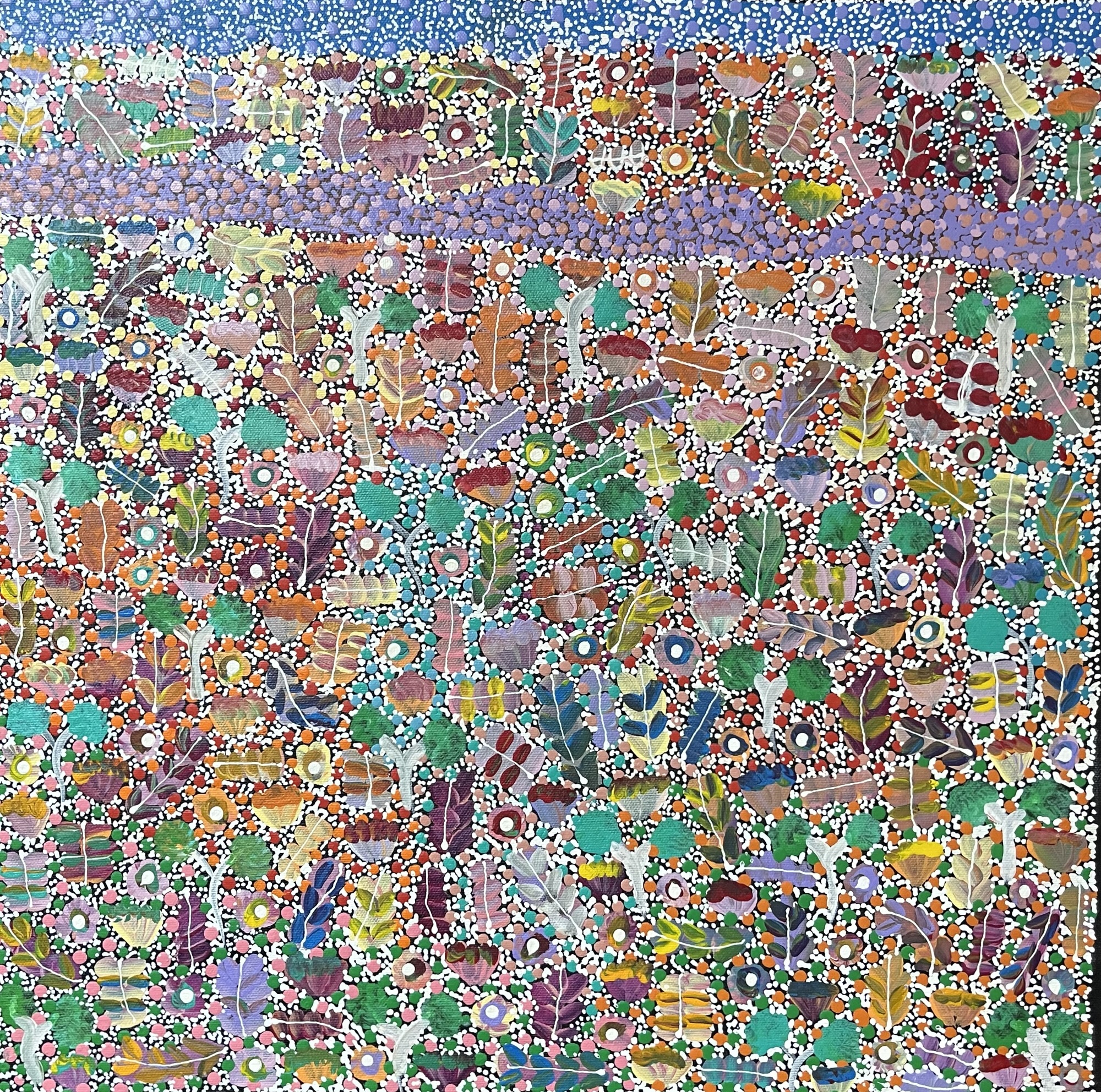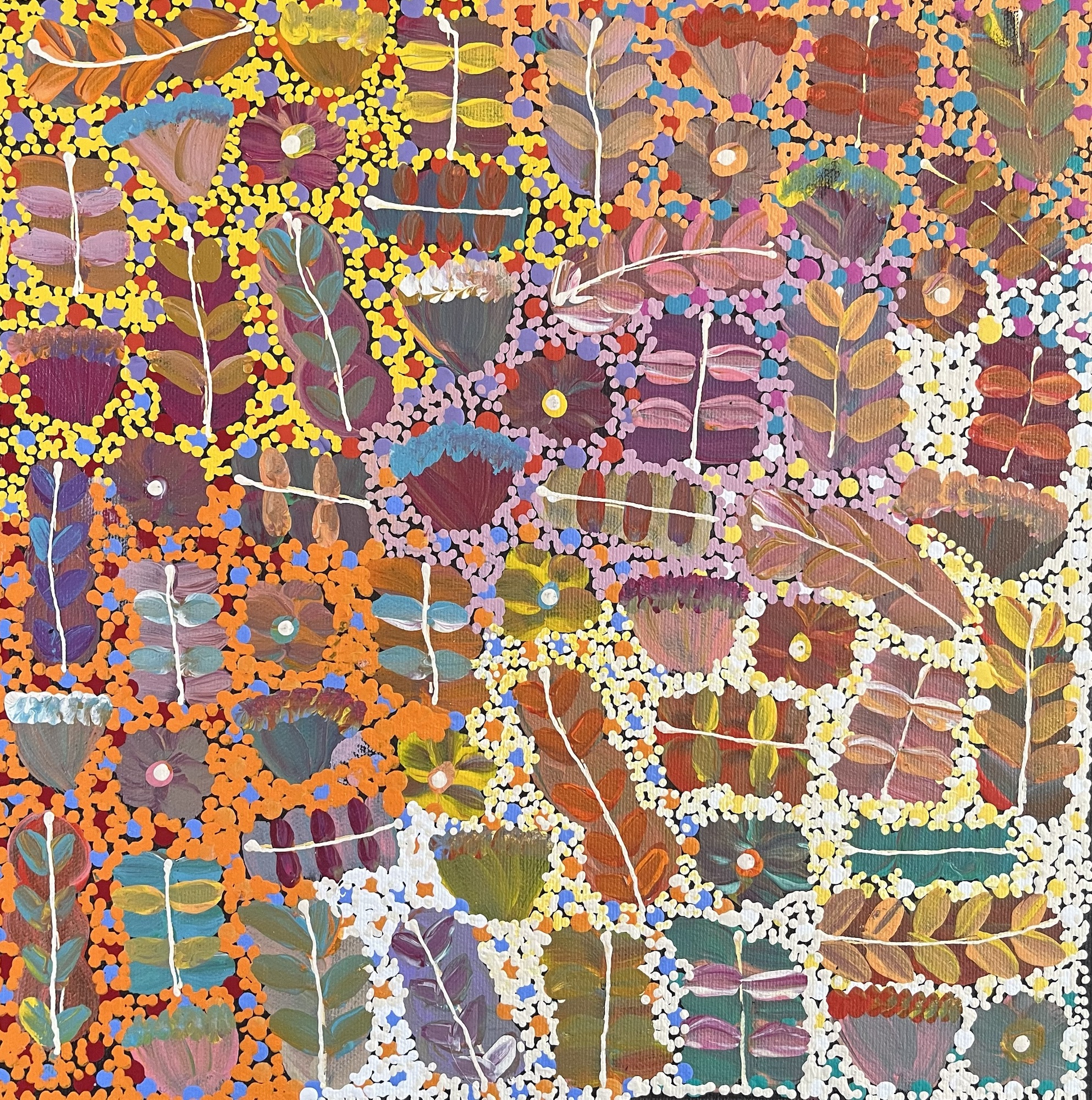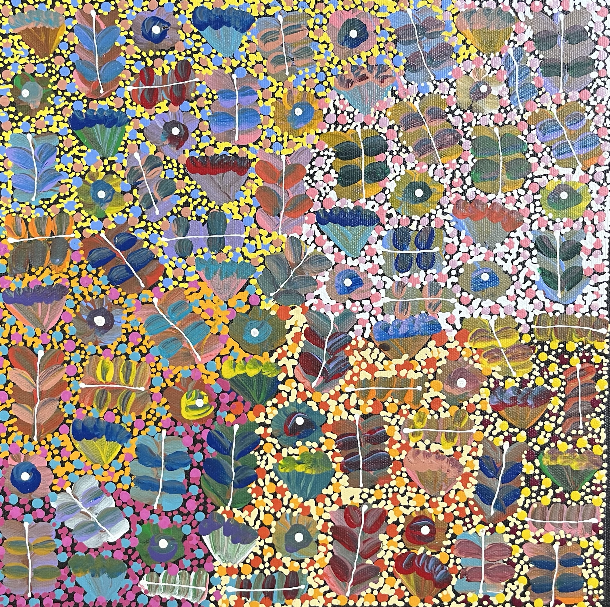 Bush medicine refers to the traditional Aboriginal use of native Australian flora for healing purposes – used to treat everything from wounds and colds to spiritual imbalances. Her paintings are a celebration of natural abundance and a visual archive of its healing power. Rendered in a joyful pallet, this peice pulses with energy and care. The meticulous dotting and leaf forms honour the connection between plants, people and place.