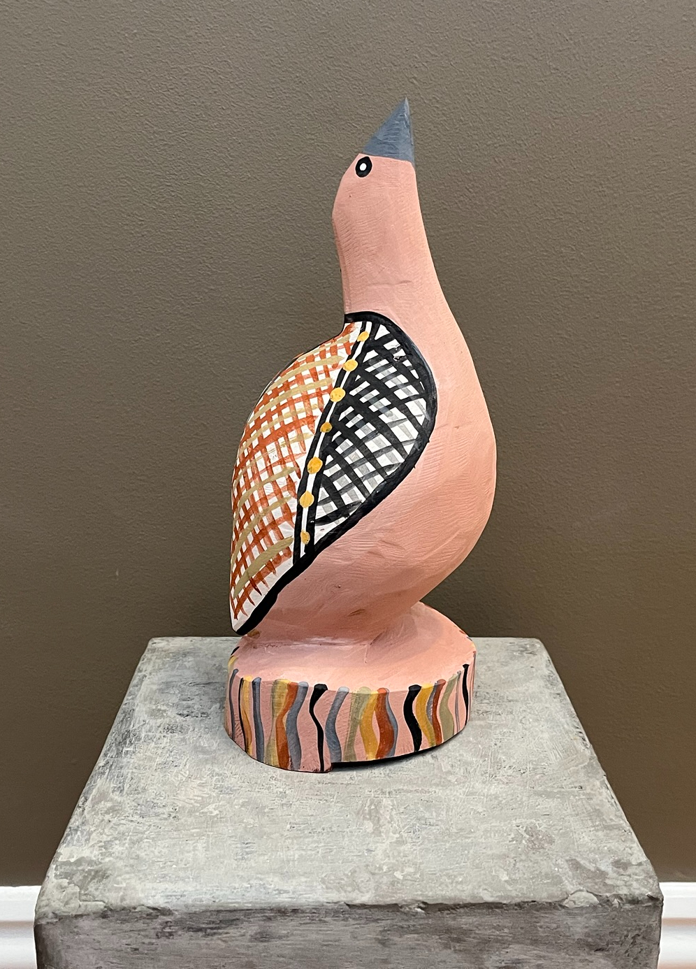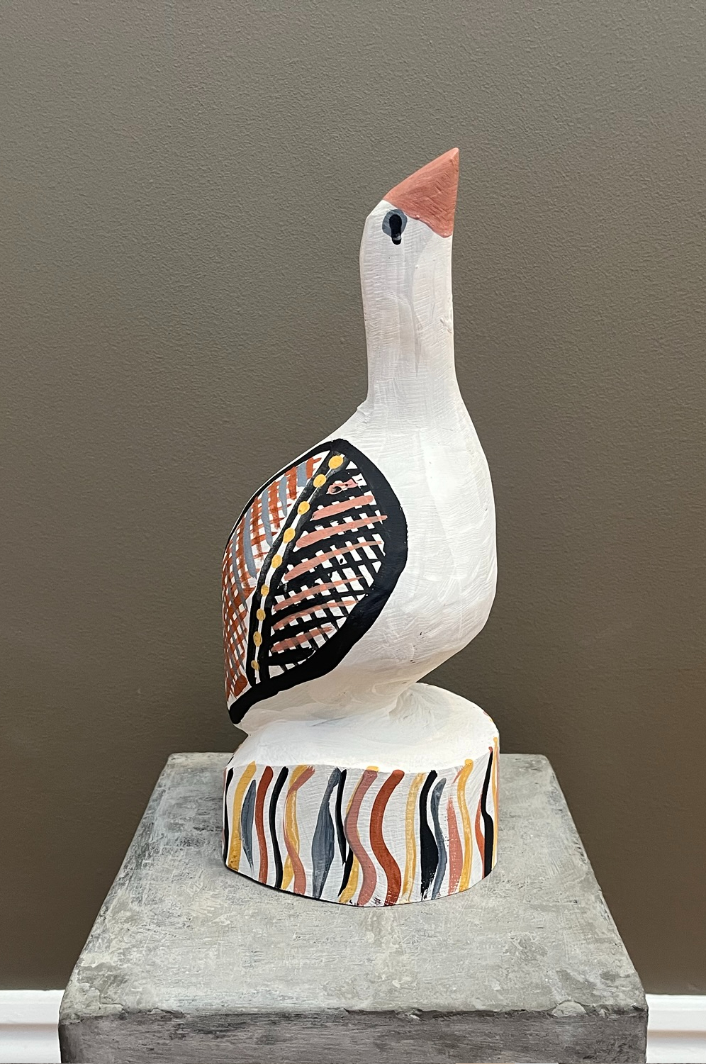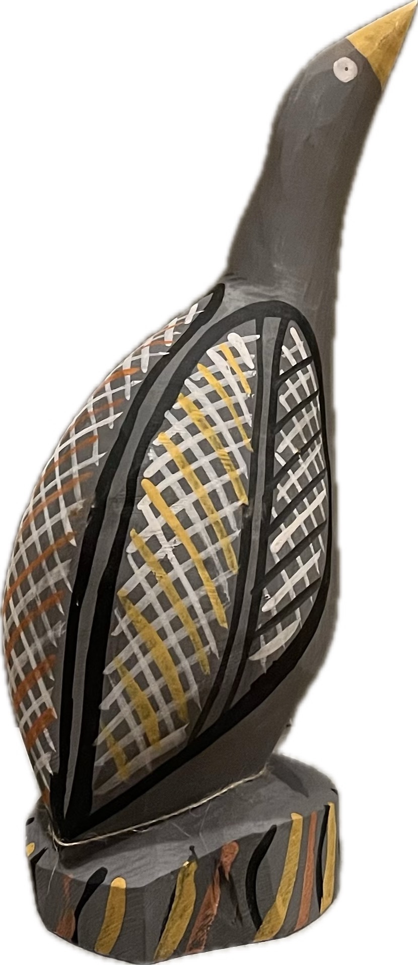 Tiwi bird carvings are hand made from ironwood and decorated with natural earth pigments. Referred to as Tokampini. They are present throughout the major creation story of the Tiwi people. Tokampini were mortal beings who acted as witnesses, messengers, mourners, informers, and lawmakers..