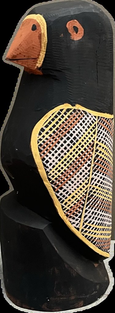 Tiwi bird carvings are hand made from ironwood and decorated with natural earth pigments. Referred to as Tokampini. They are present throughout the major creation story of the Tiwi people. Tokampini were mortal beings who acted as witnesses, messengers, mourners, informers, and lawmakers..