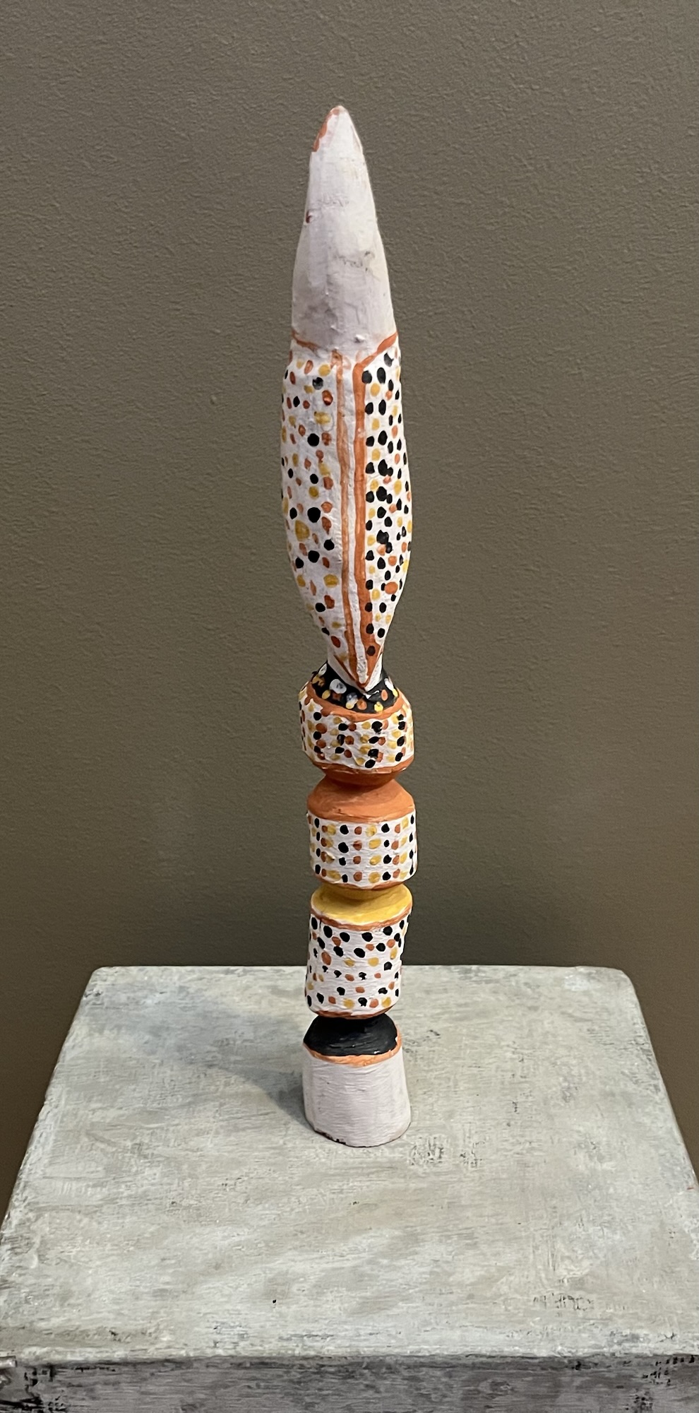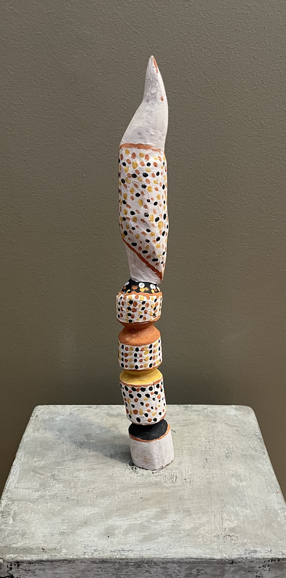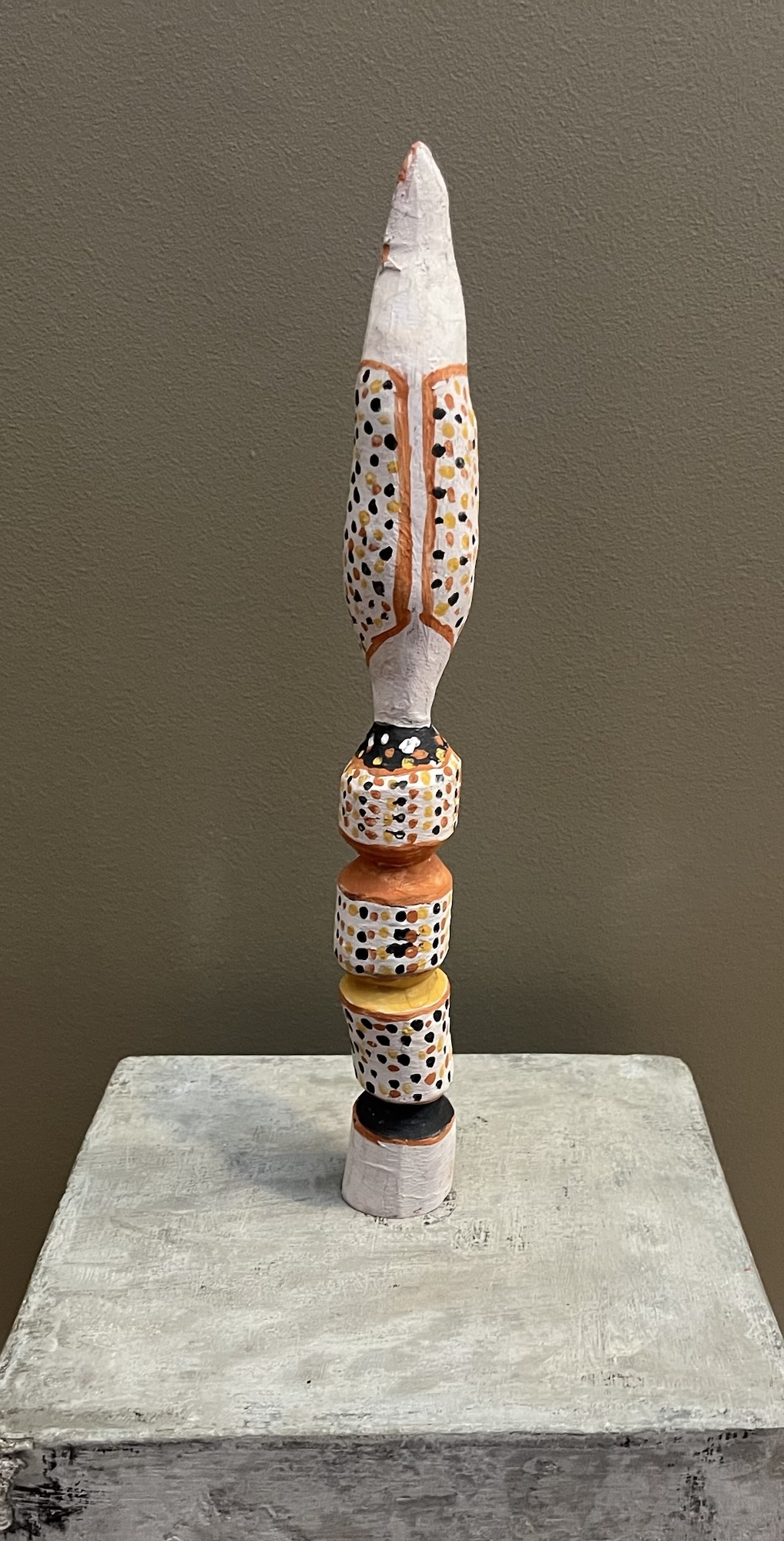 Tiwi bird carvings are hand made from ironwood and decorated with natural earth pigments. Referred to as Tokampini. They are present throughout the major creation story of the Tiwi people. Tokampini were mortal beings who acted as witnesses, messengers, mourners, informers, and lawmakers..