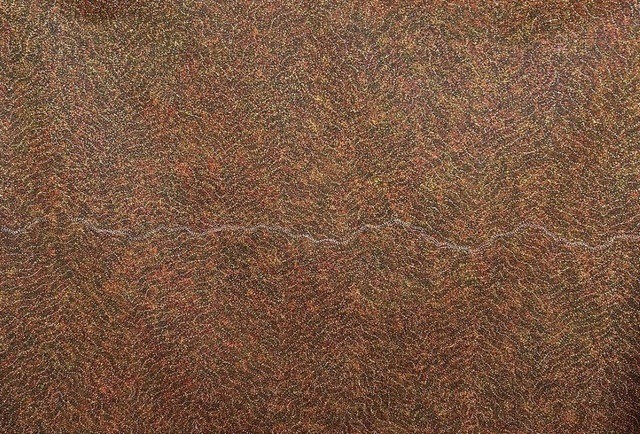 Through layers of fine dotting Annie maps the sifting sandhills (tali) and the scattered seeds of bush food that are vital for sustanance and cultural ceremony. Annie’s work invites close inspection, revealing the depth of knowledge and connection that underpins every mark. Annie Nelson’s painting is a quiet, meditative homage to the desert landscape and the wisdom it holds.