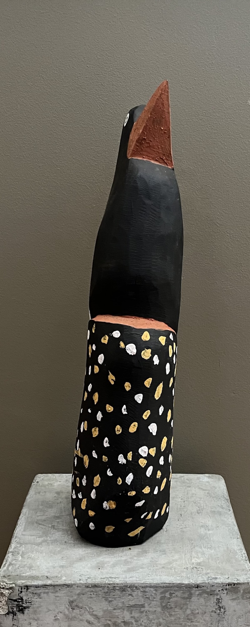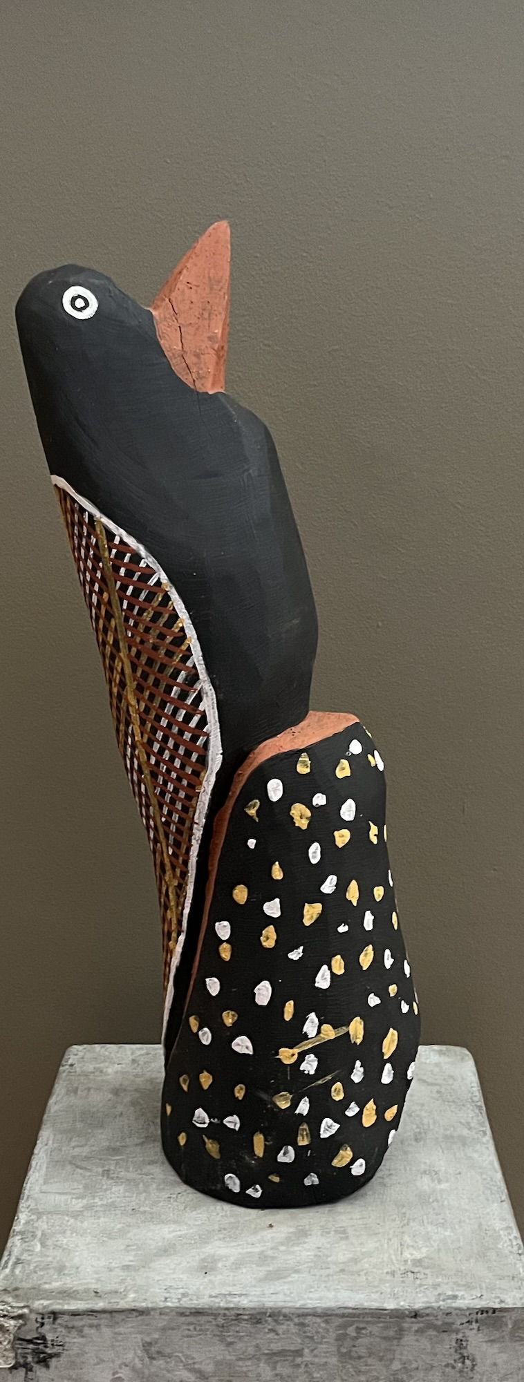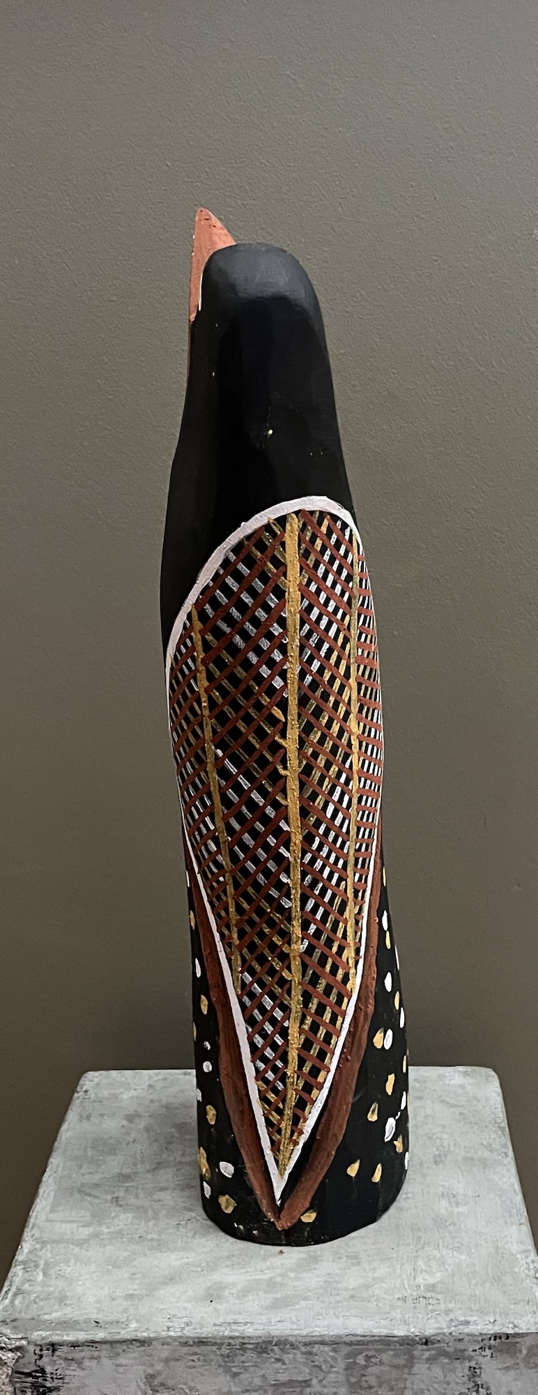 Tiwi bird carvings are hand made from ironwood and decorated with natural earth pigments. Referred to as Tokampini. They are present throughout the major creation story of the Tiwi people. Tokampini were mortal beings who acted as witnesses, messengers, mourners, informers, and lawmakers..