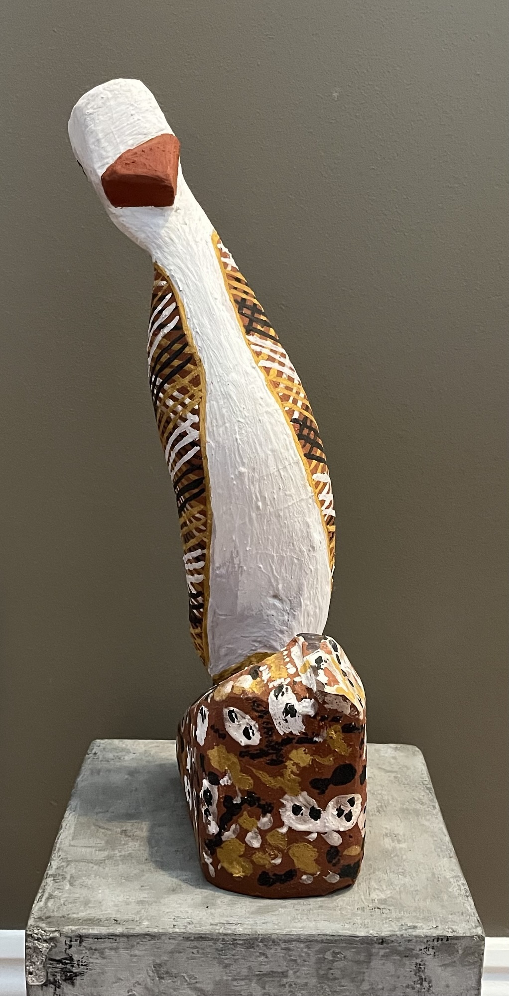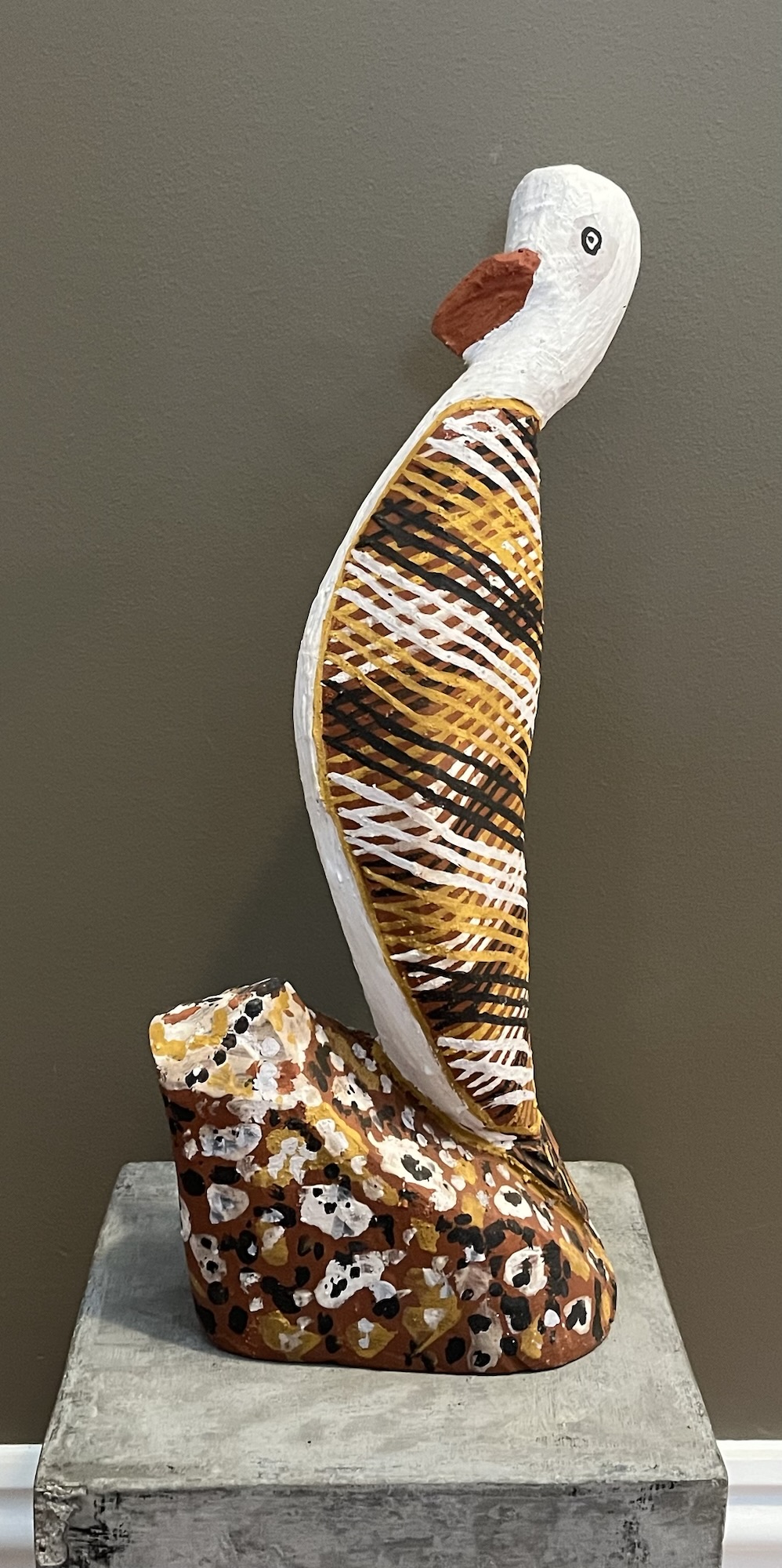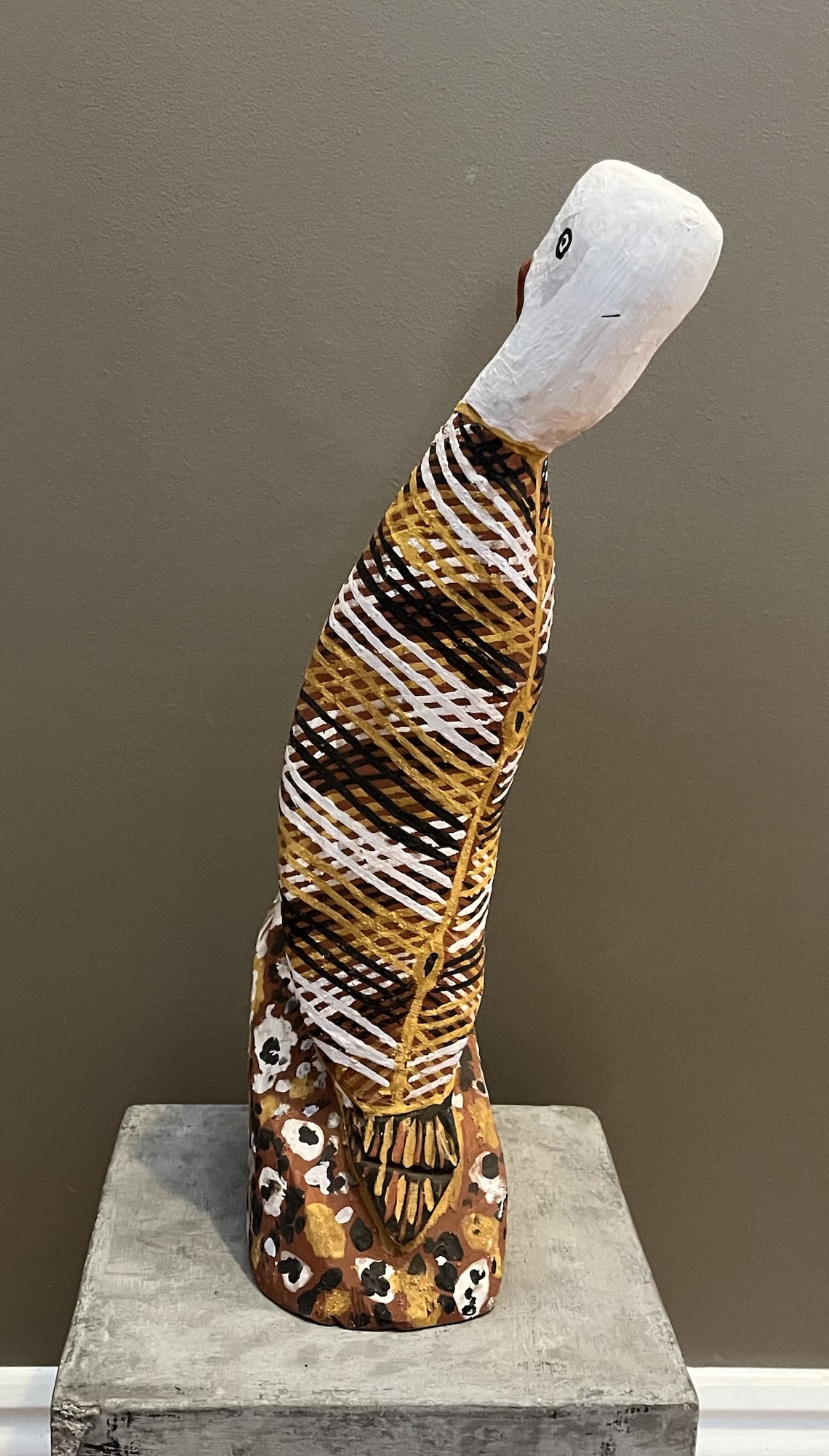 Crafted from dense, locally sourced ironwood and hand-painted with natural ochres, this elegant bird sculpture by Tiwi artist John H Tipiloura captures the spirit and beauty of Tiwi fauna. The graceful curve of the bird’s form and the delicate detailing on the wings reflect Tipiloura’s skill as a carver and his deep cultural connection to Country.