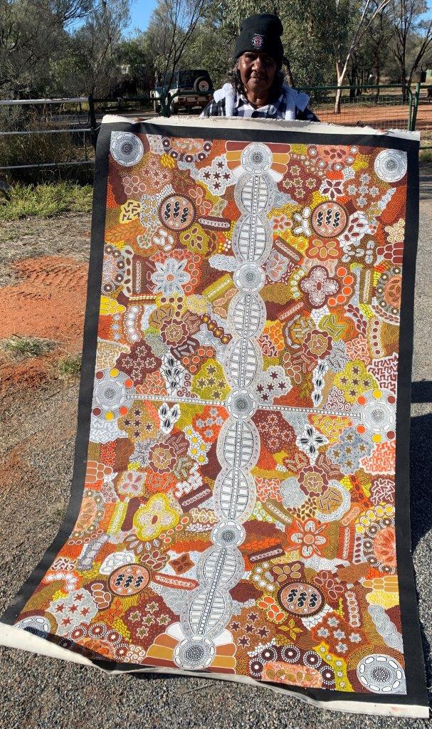 In Bush Tucker Dreaming, Margaret Wallace Nungurrayi celebrates the richness and abundance of her Country through intricate patterning and vibrant earthy tones. This large-scale work is alive with detail—an immersive tapestry of bush foods, flowers, and leaves that nourish both body and spirit.