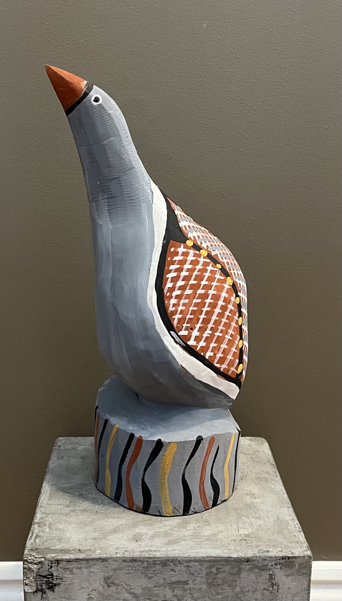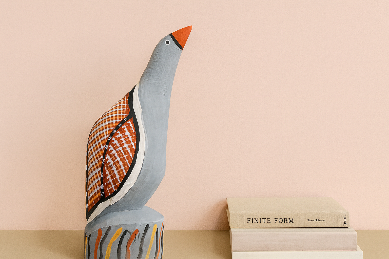 This sculpture is carved from ironwood, a native hardwood prized for its durability and fine grain. The base design, featuring wave-like curves and ochre striping, evokes the coastal environment and tides that shape Tiwi life. The bird itself may represent one of the many local species significant in Tiwi lore and ecology.