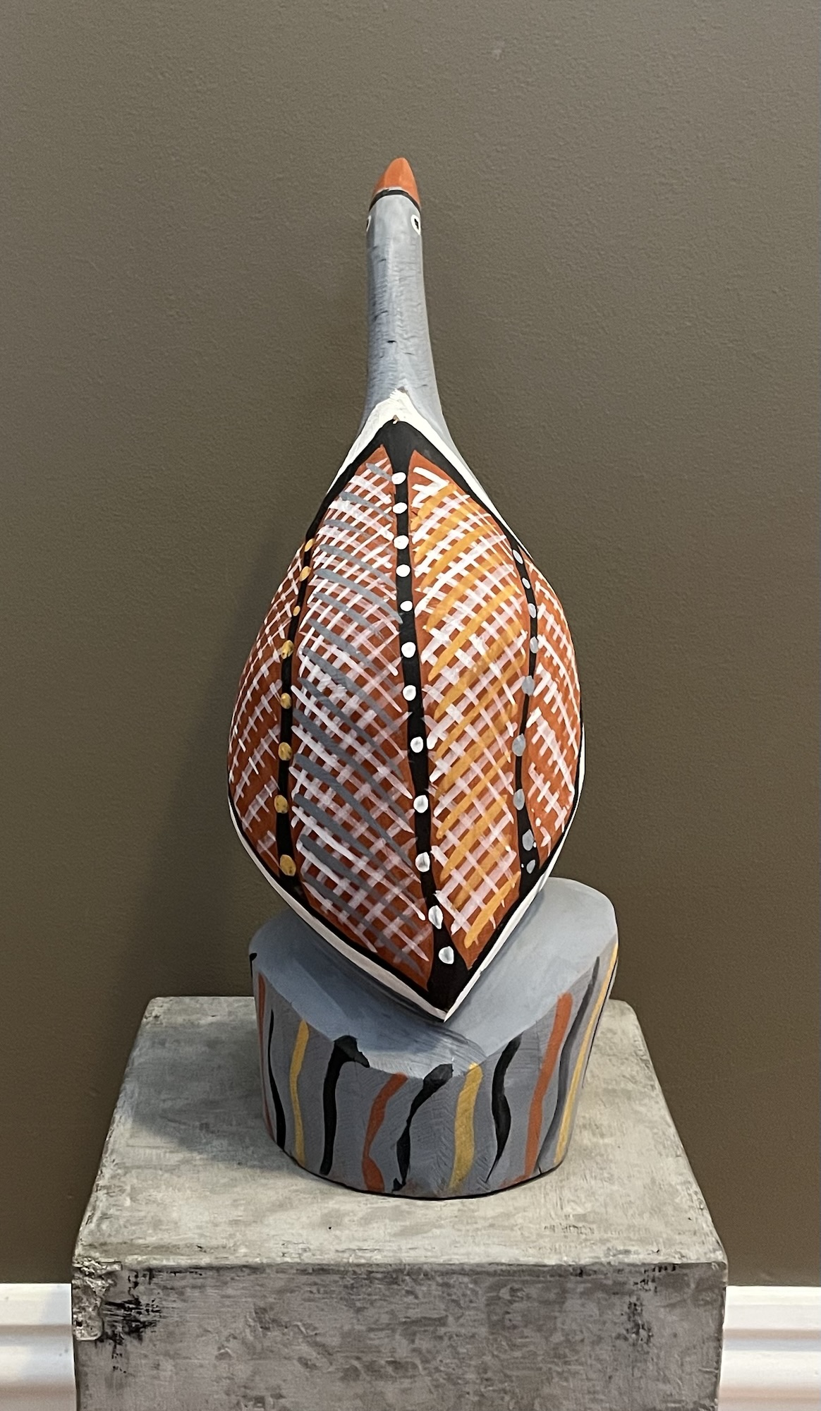 Michael Munkara, a respected Tiwi artist, brings to life the spirit of his homeland through this elegant ironwood bird carving. With its upright stance and delicately pointed beak, the sculpture radiates both grace and character. The body is painted in natural ochres with intricate Jilamara (Tiwi design) patterns on the wings and base—featuring flowing lines and cross-hatched motifs that reflect the ceremonial and artistic traditions of the Tiwi Islands.