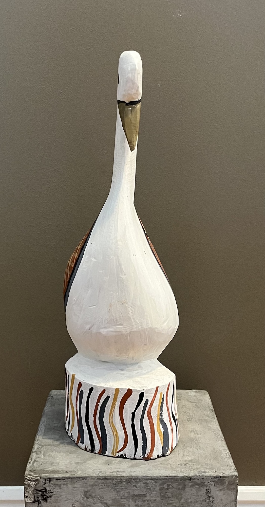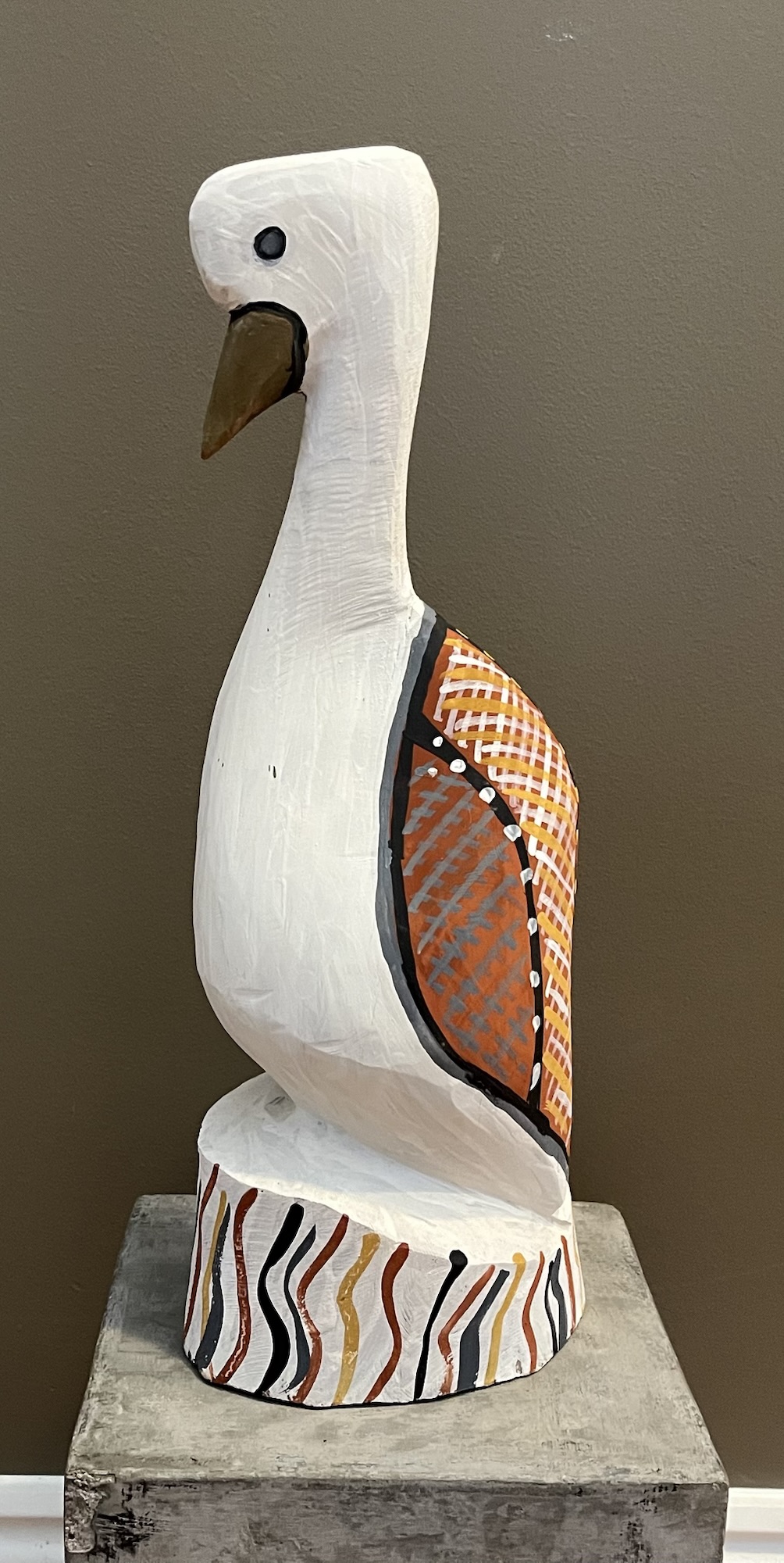 This sculpture is carved from ironwood, a native hardwood prized for its durability and fine grain. The base design, featuring wave-like curves and ochre striping, evokes the coastal environment and tides that shape Tiwi life. The bird itself may represent one of the many local species significant in Tiwi lore and ecology.