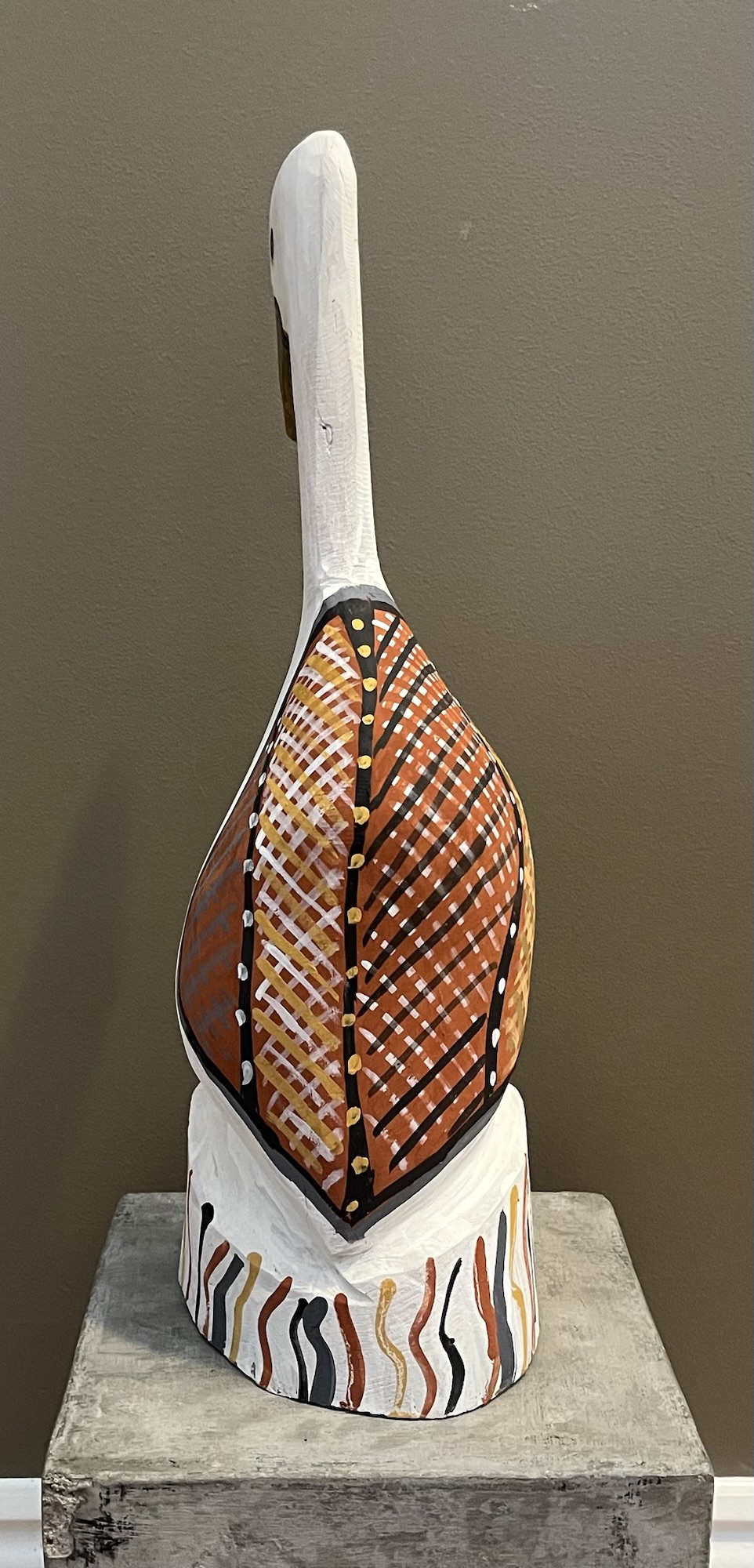 Michael Munkara, a respected Tiwi artist, brings to life the spirit of his homeland through this elegant ironwood bird carving. With its upright stance and delicately pointed beak, the sculpture radiates both grace and character. The body is painted in natural ochres with intricate Jilamara (Tiwi design) patterns on the wings and base—featuring flowing lines and cross-hatched motifs that reflect the ceremonial and artistic traditions of the Tiwi Islands.