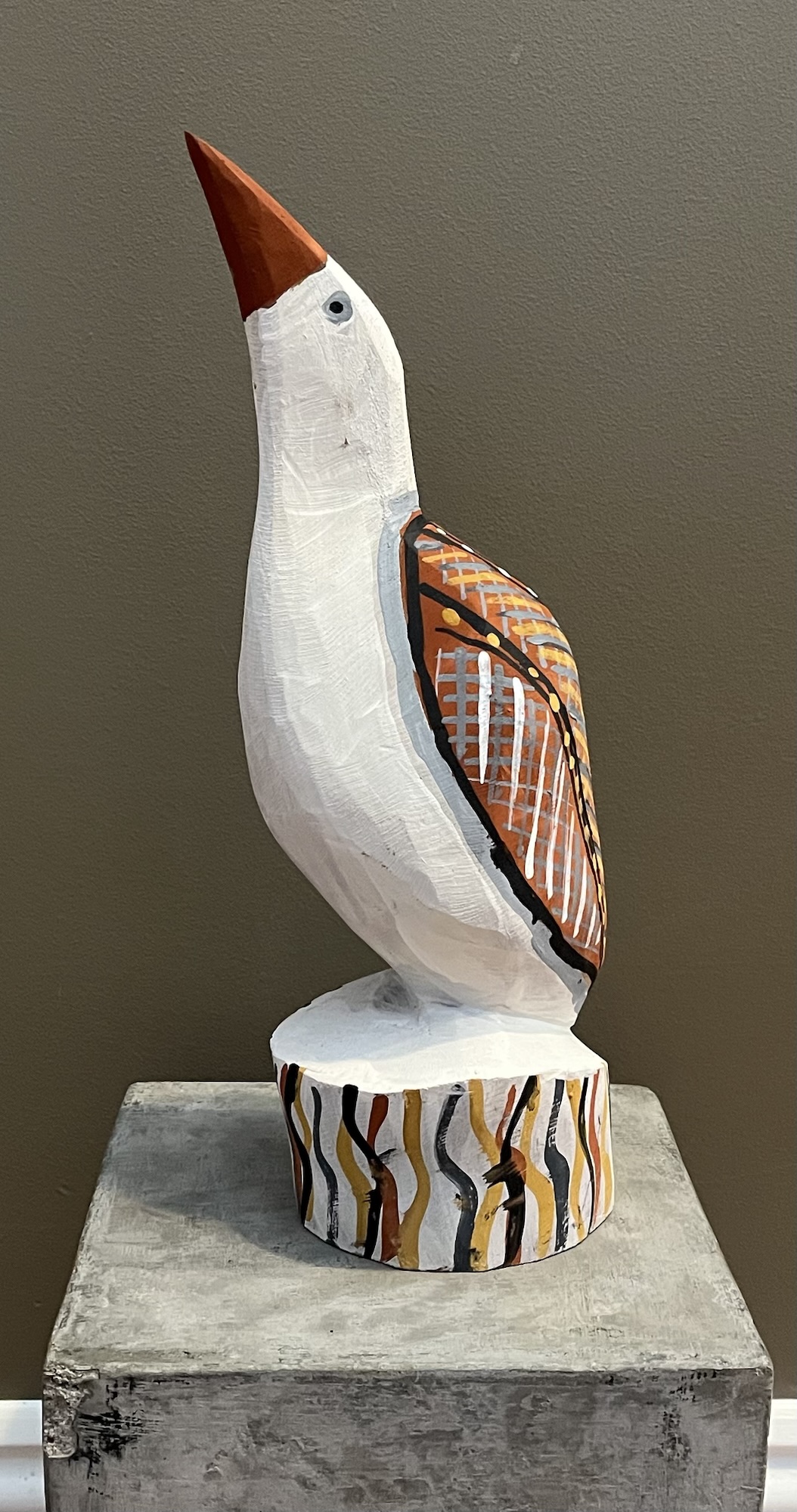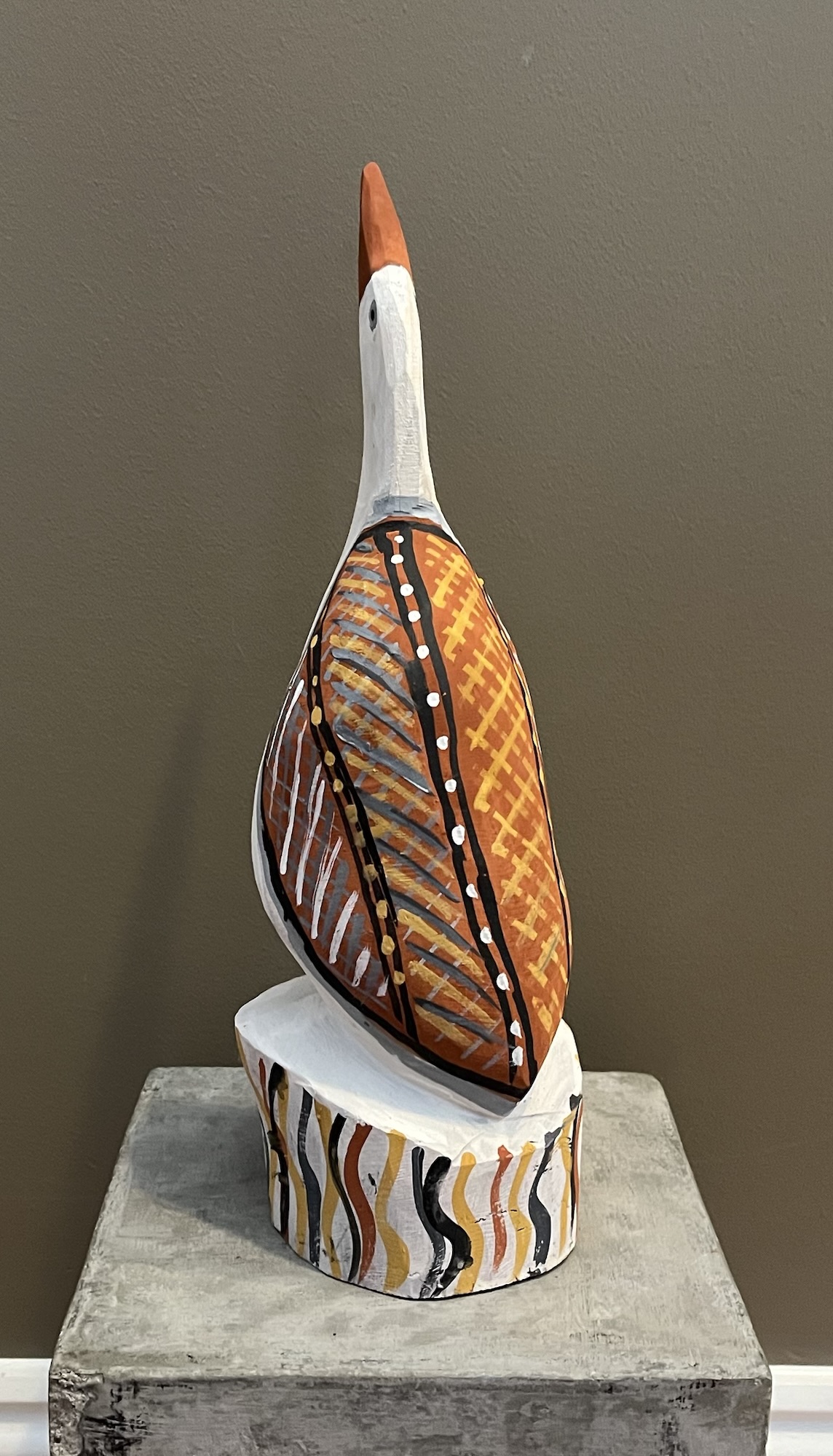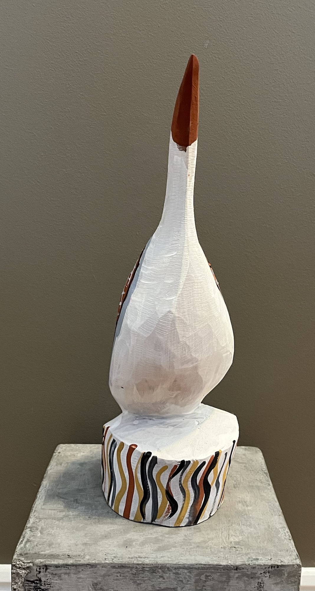 This sculpture is carved from ironwood, a native hardwood prized for its durability and fine grain. The base design, featuring wave-like curves and ochre striping, evokes the coastal environment and tides that shape Tiwi life. The bird itself may represent one of the many local species significant in Tiwi lore and ecology.