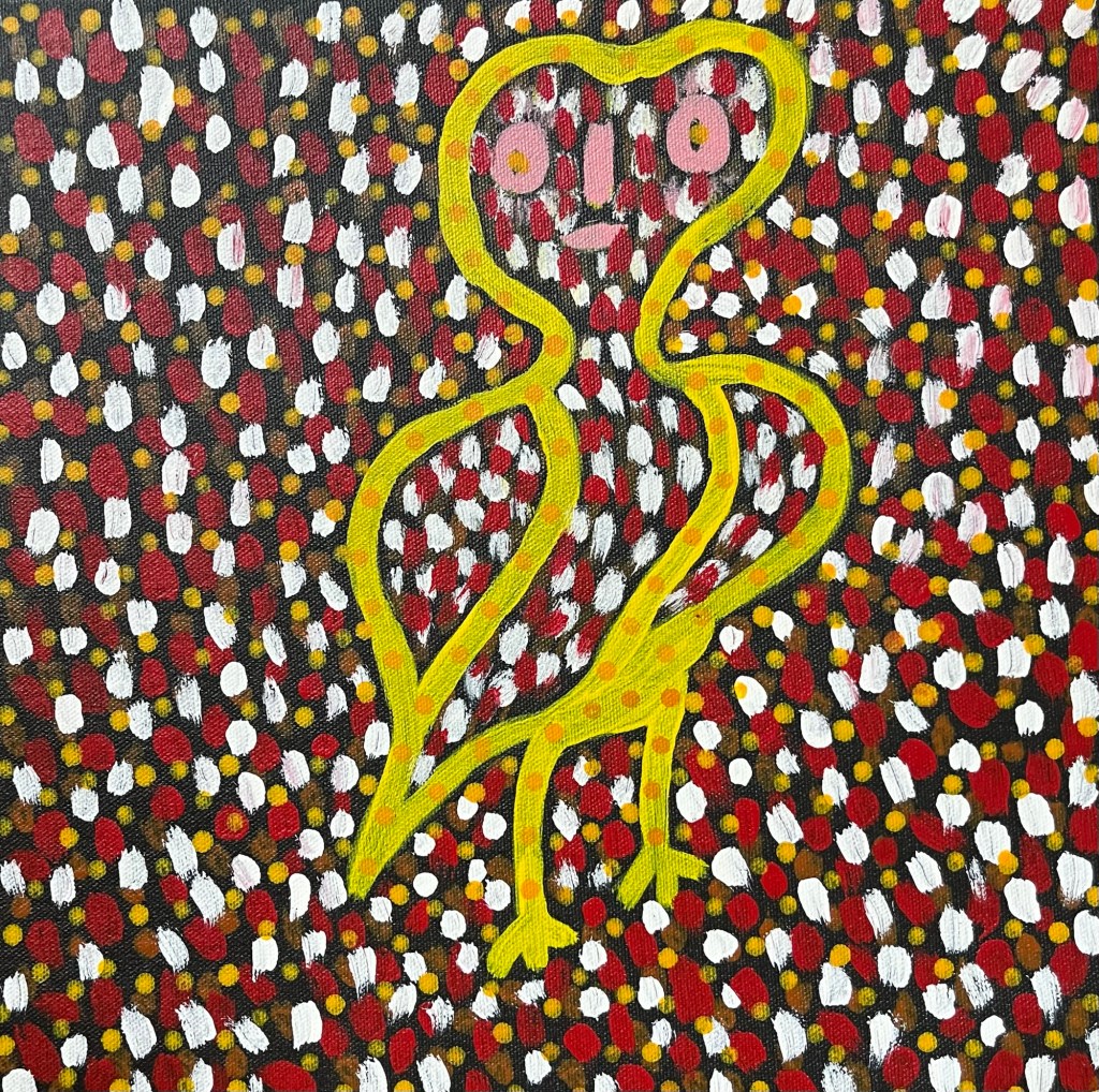 Owls hold a cultural significance in many Aboriginal communities, often seen as spiritual messangers or protectors. Kunnoth’s work blends joyful expression with cultural symbolism. His owl speaks to the enduring power of nature and ancestral knowledge, rendered in a style that is at once playful and deeply rooted in tradition.
