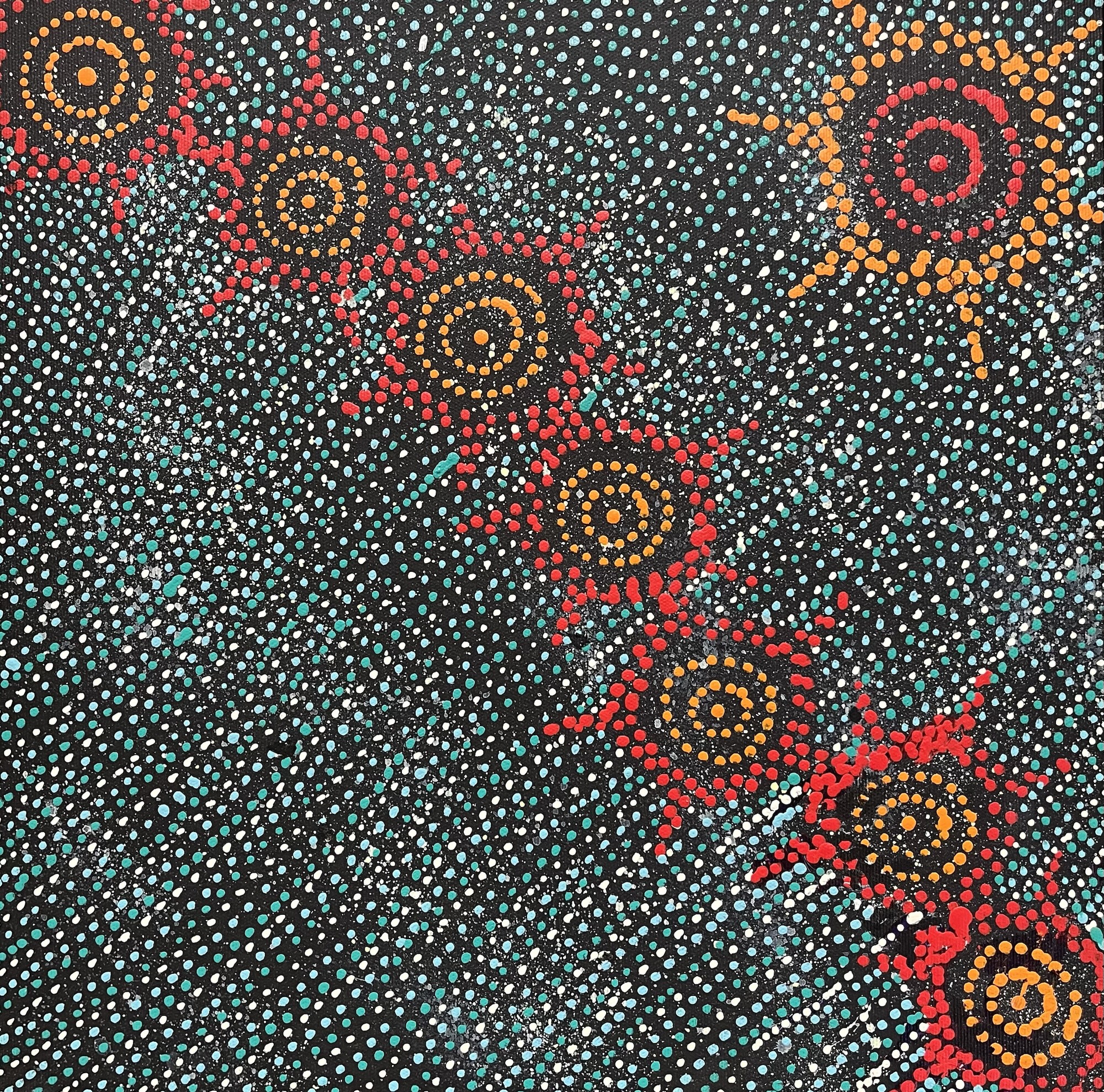 In this captivating painting, Shanna Napananangka Williams tells the ancestral story of the Seven Sisters Dreaming—a powerful and widely shared narrative across many Aboriginal Nations. The work depicts the celestial journey of seven ancestral women as they travel across the night sky, pursued by a shape-shifting ancestral being. This Dreaming connects land to sky, culture to cosmos, and women’s strength to timeless storytelling.