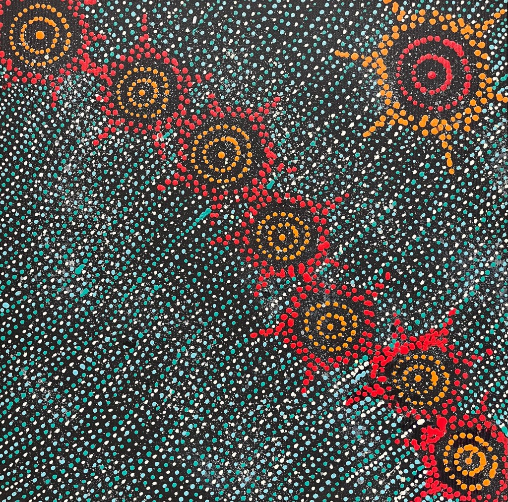 Shanna uses a vibrant palette of teal, white, red, and ochre to bring this story to life. The Sisters are rendered as a constellation of radiant, concentric forms, weaving diagonally across the canvas in a rhythmic procession. The dotting throughout symbolises the vastness of Country and the spiritual pathways that bind the sisters to the land and each other.