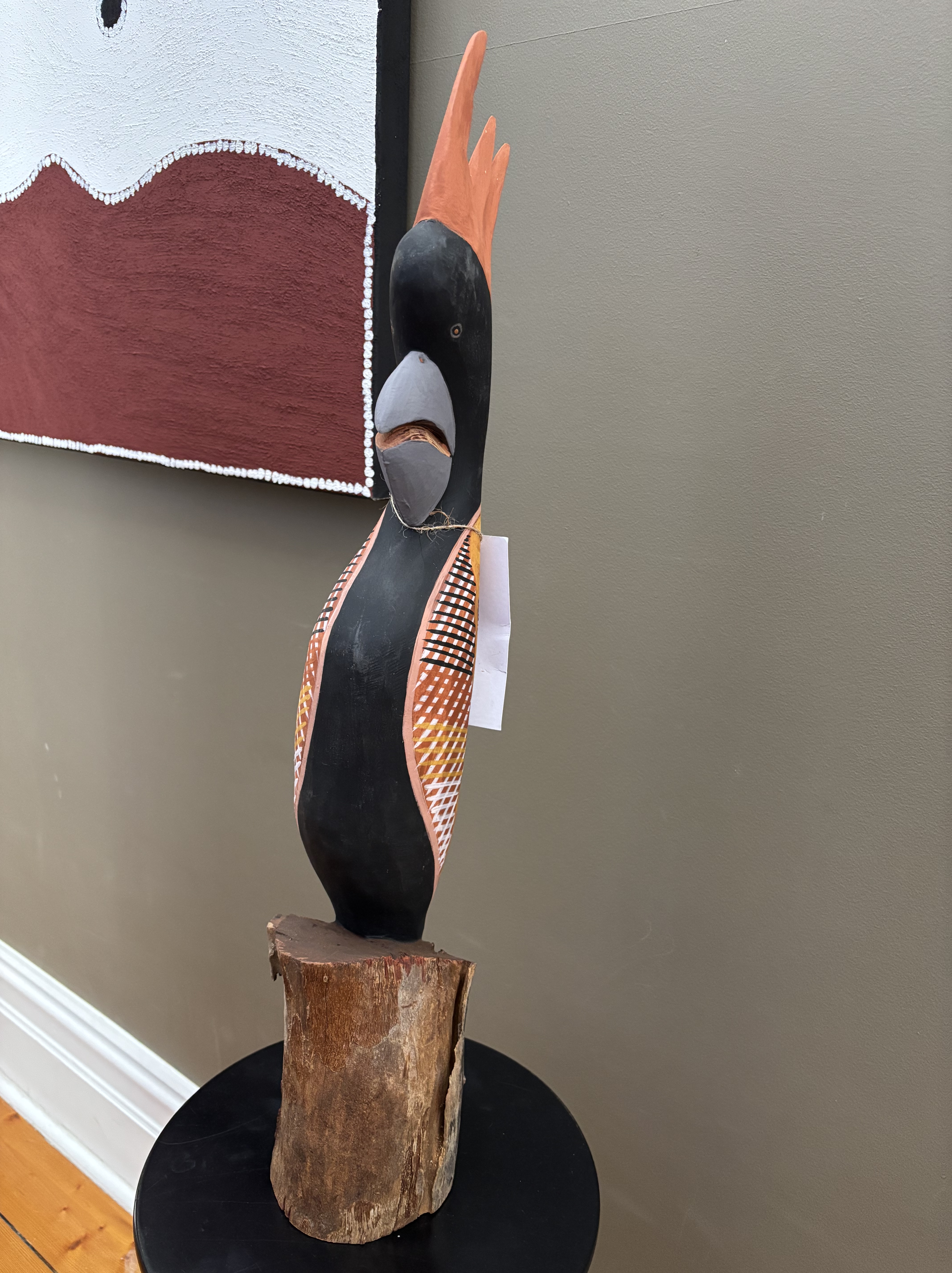 This stunning sculpture by Tiwi artist Thomas Munkanome brings the spirit of the Black Cockatoo to life through bold form and delicate detail. Hand-carved from ironwood and painted with natural ochres, each bird embodies a sense of strength, wisdom, and character. The sweeping crest and intricate Jilamara (body painting designs) on the wings echo Tiwi ceremonial traditions and deep cultural knowledge.