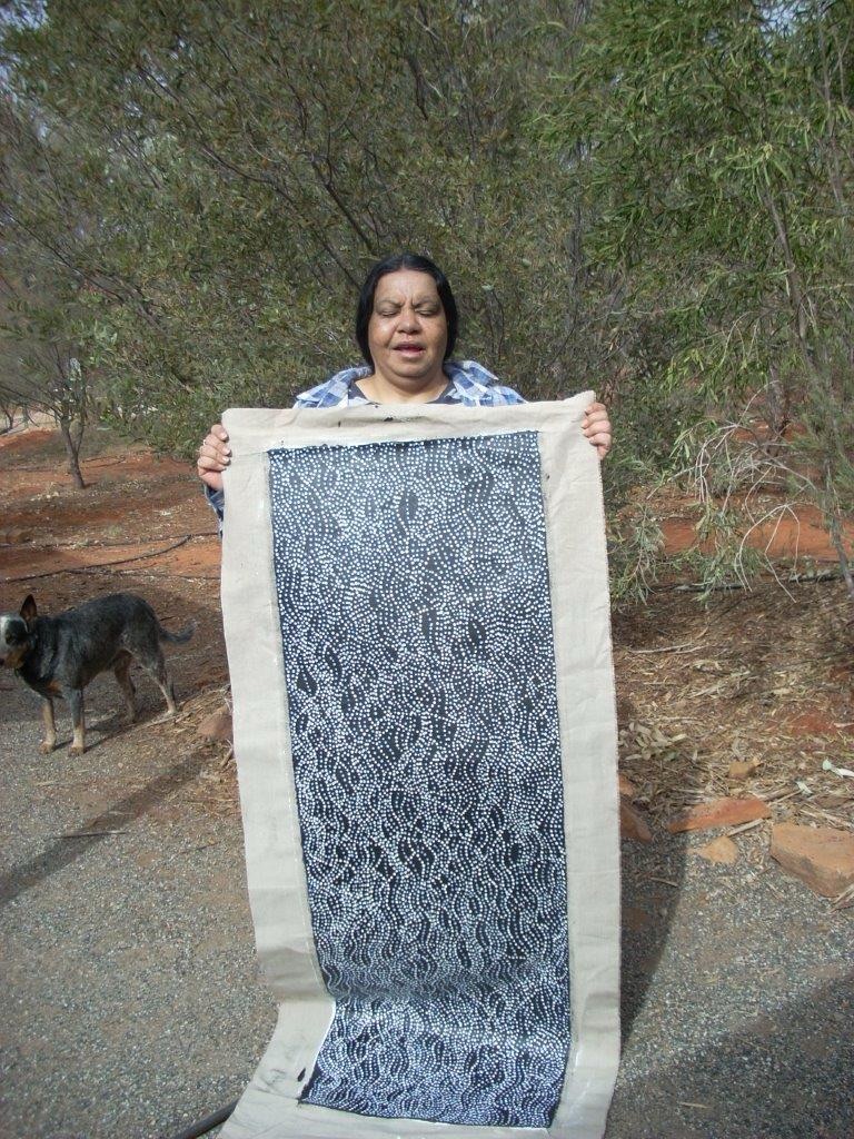 ‘In My Grandmother’s Country, Theresa Pula draws on deep familial and cultural memory to honour the matriarchs of her community and the land they nurtured. This elegant work pulses with movement—dot work flowing like a river of inherited knowledge, each stroke a tribute to the journeys, ceremonies, and songlines passed down through generations.
